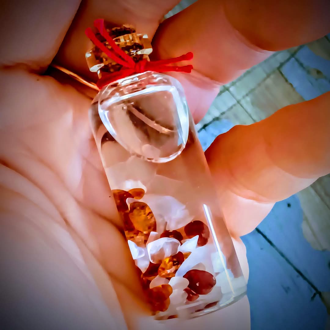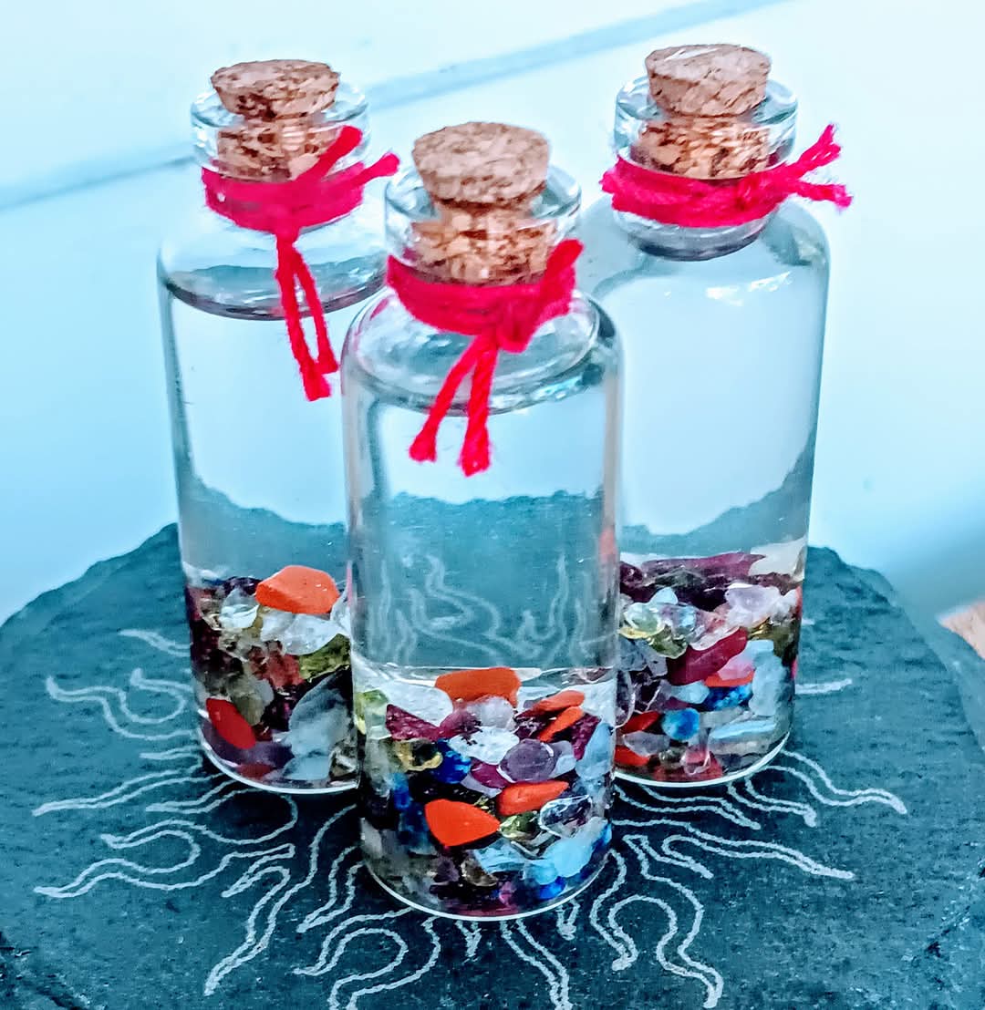 Comes as a set of three glass corked bottles; chakra crystal infused, healing and intuitive crystal infused, and strength and growth crystal infused.