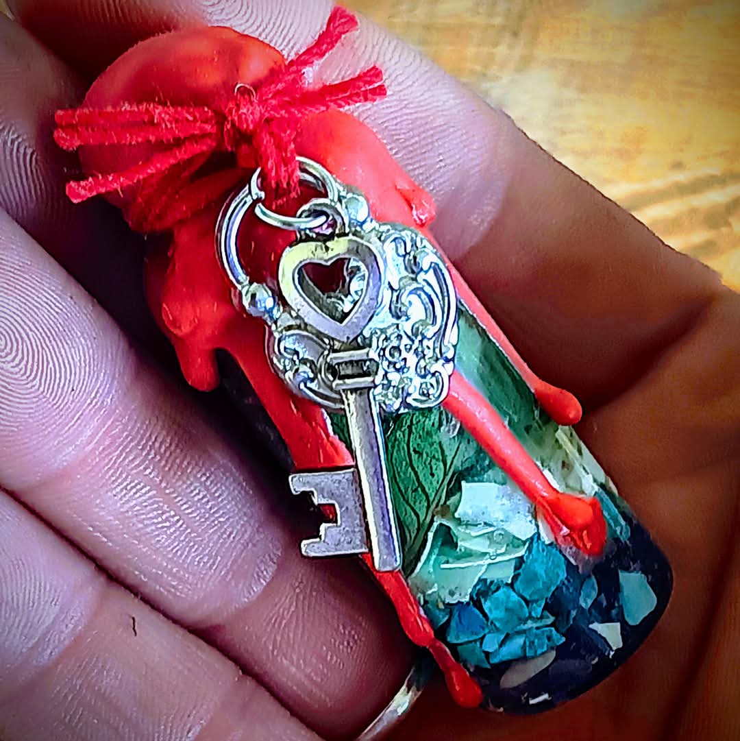 Since each one is personalized to each person who orders, no one jar is the same. Even though the ingredients differ per order, they all are individually blessed and contain premium herbs, top shelf crystals and salts, vibrant flowers, unique charms, pure essential oils, authentic homemade moon water and more all packed into pocket sized, corked, glass apothecary jars. They are sealed with quality beeswax candle wax and finished with a protective red thread and skeleton key. Each set comes with instructions that explain how to properly activate and charge your jars.